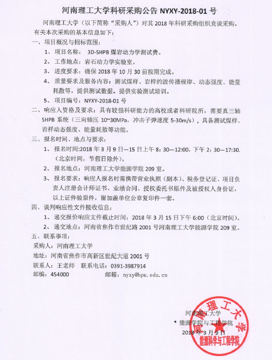 河南理工大学科研采购公告NYXY-2018-01号